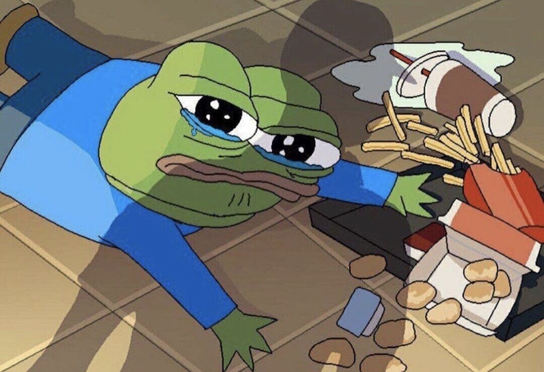 This pepe always hits different. I think it's because we've all been in a situation like this at one point or another growing up. We've all fallen down and spilled whatever we were holding and it sucked. The shadow of the individual looking down on this pepe represents the shame and embarrassment we feel when this happens. All we wanted was to enjoy our meal but now it's wasted and we're on the ground with everyone looking. It sucks.